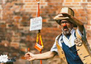 En el escenario, un payaso cautivador disfruta de un almuerzo de lo más original. Mediante el arte de la mímica y el clown, el protagonista, el Sr. Brush, logra conectar con un público diverso, compuesto por adultos y niños, gracias a una actuación dinámica y llena de energía.